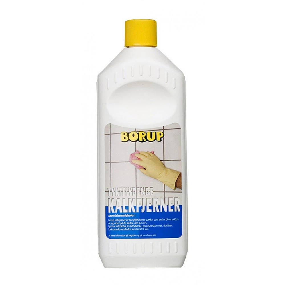 Borup Kalkfjerner er en tyktflydende væske, som derfor bliver siddende og virker på de steder den påføres. Fjerner kalkpletter fra håndvaske, porcelænskummer, forkromede overflader samt rustfrit stå