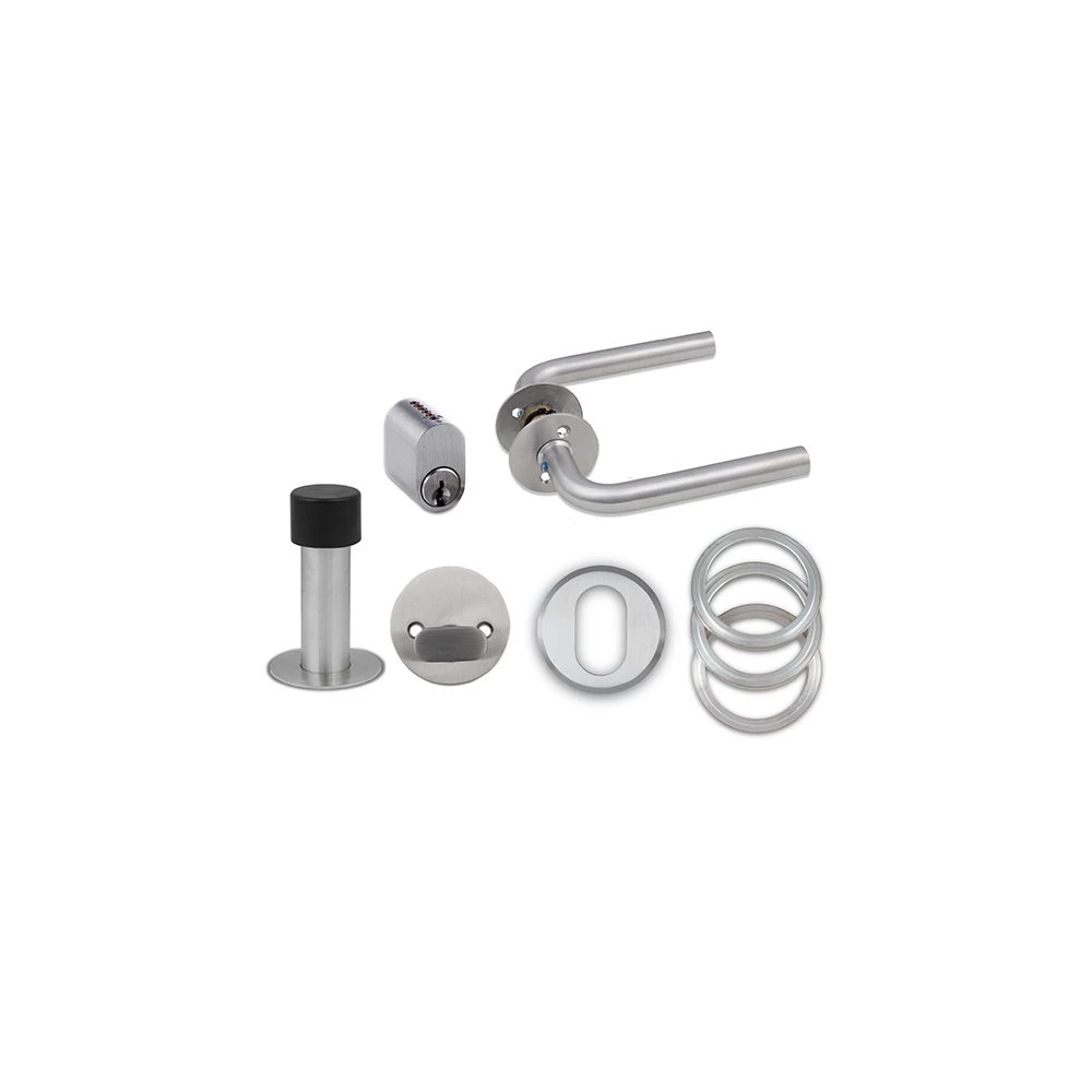 Vær den første til at anmelde “Jasa Kombisæt L-form 19mm Greb,vrider, UniCylRinge, Dørstop & Cyl. – 13398” Annuller svar