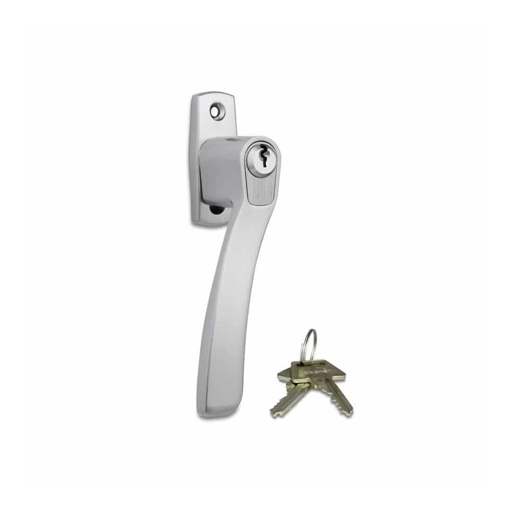 Paskvilgreb med 6 stift cylinder i smart og enkelt design i mat forniklet stål. Greb til venstre hånd. Anvendes til vinduer eller terrassedøre. Cylinderen kan omlægges. Leveres med 2 stk. nøgler. Pakket i pose.