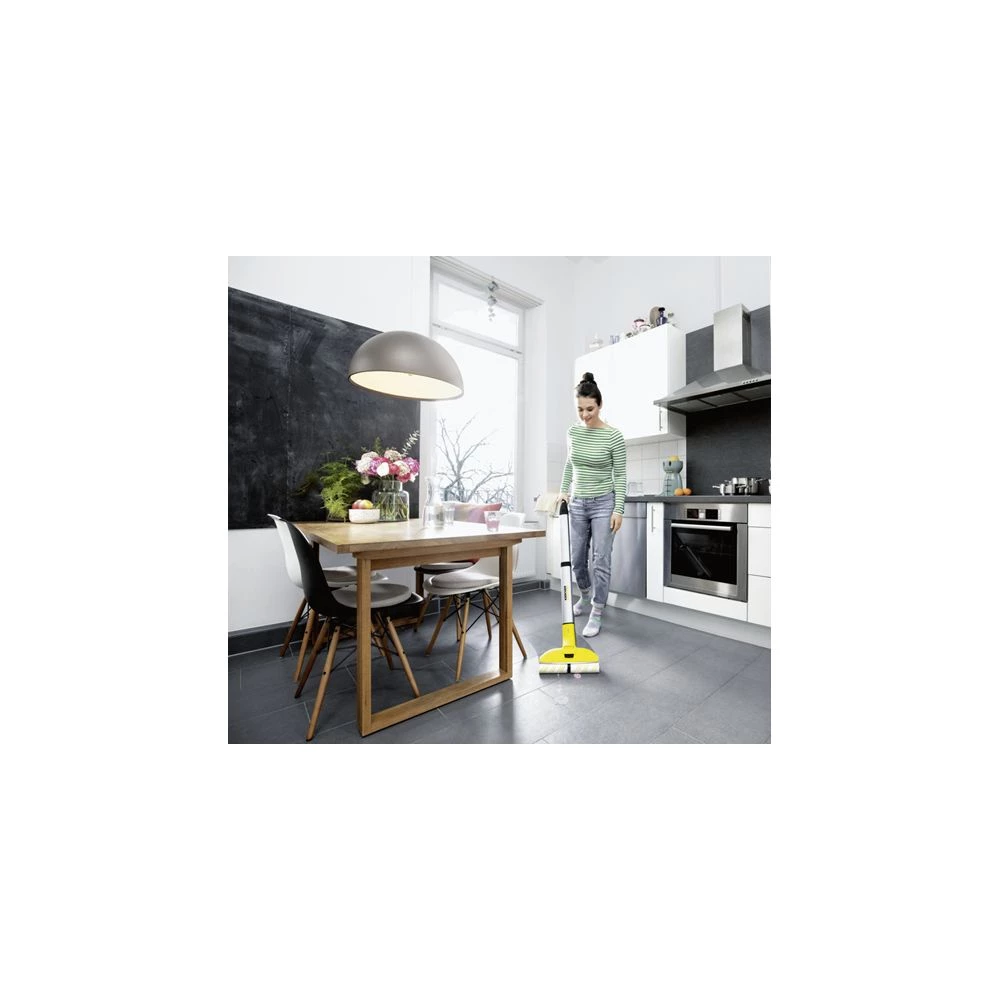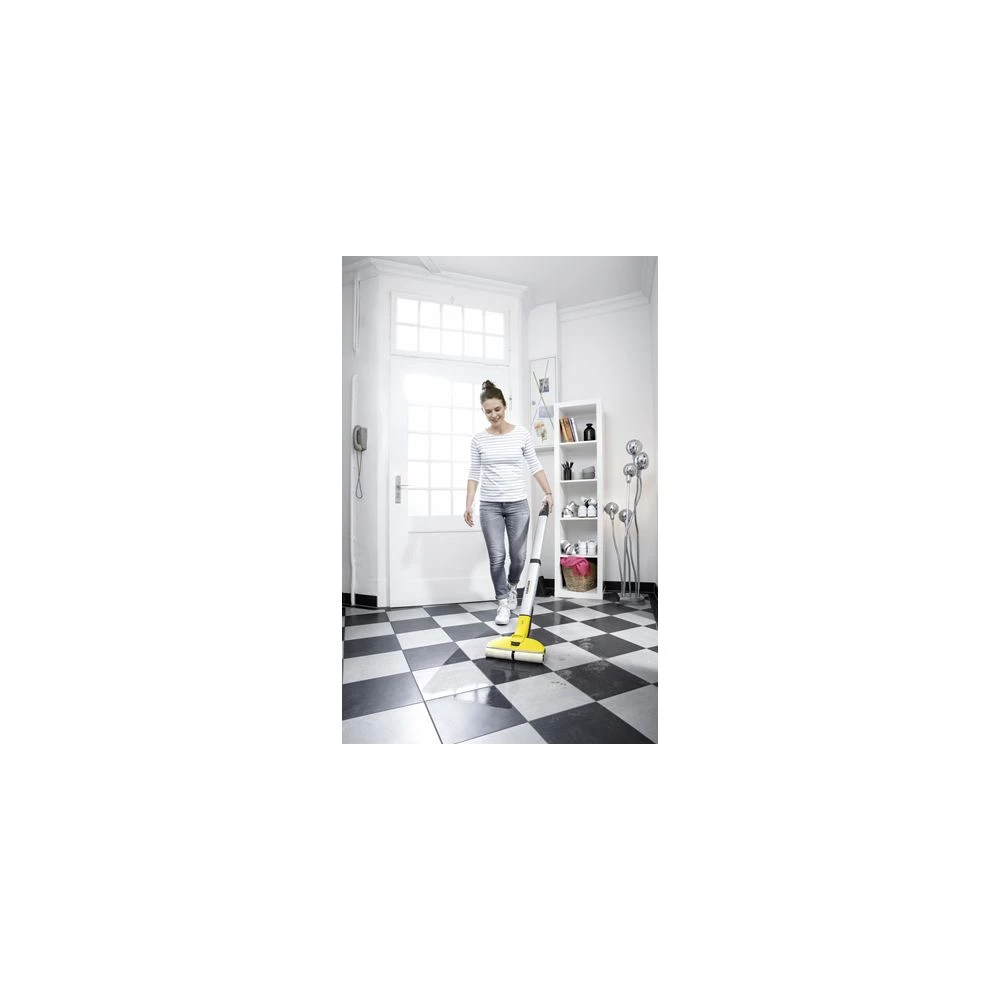 Med den nye FC 3 batteridrevne gulvvasker får du rent gulv uden besvær! De roterende mikrofiberruller fugtes med rent sæbevand mens det beskidte vand opsamles i en separat beholder. Gulvet bliver op til 20% renere end ved vask med traditionel moppe og spand. Det strømlinede design gør det nemt at komme helt ud til kanten og ind under møblerne – også fylder den ikke meget i kosteskabet. Den bruger kun 360 ml vand til rengøring af ca 60 m2 gulv og gulvet er tørt igen på under 2 min. Det gør den velegnet til skånsom vask af alle typer gulve som f.eks. parketgulve. Det kraftige 7,2 V lithium-ion batteri giver maksimal bevægelsesfrihed og 20 brugstid. LED indikator viser hvor meget strøm der er tilbage på batteriet.