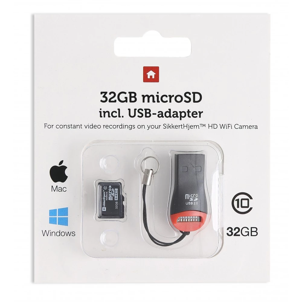 SIKKERTHJEM™ HUKOMMELSESKORT 32GB MICROSD CLASS 10 INKL. USB-ADAPTER TIL PC/MAC