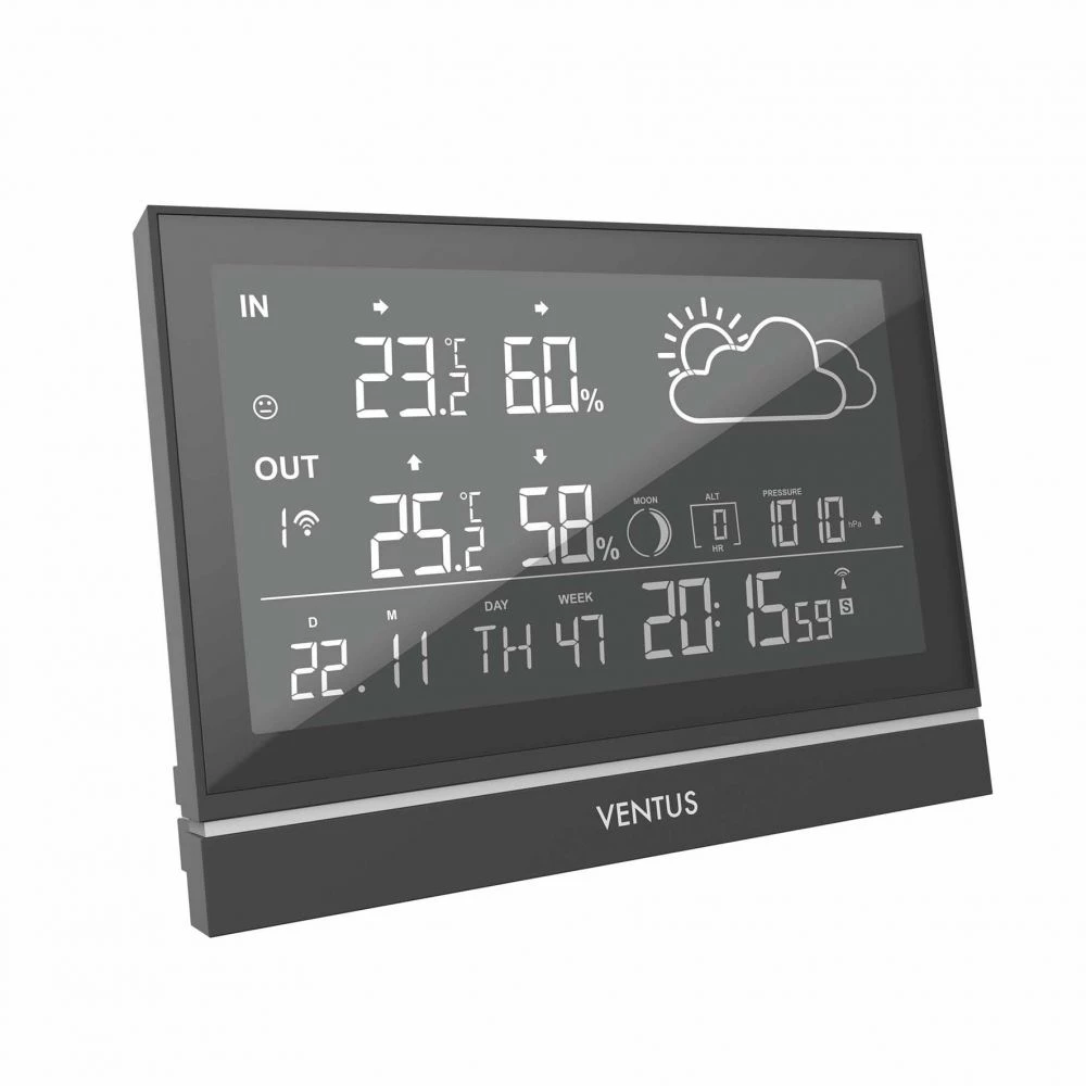 Elegant designet VENTUS vejrstation med stort tydeligt display. Giver dig en lokal vejrudsigt og vejrmålinger fra terrassen, haven eller altanen. Alt sammen overført fra din/dine trådløse sensorer. W200 giver dig lokale målinger på inde/udendørs temperatur og luftfugtighed, lufttryk, samt kalender med dag, dato og klokken.